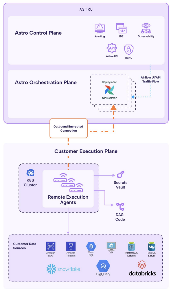 All communication between the execution plane and Astro’s orchestration plane uses outbound-only, encrypted connections. The Remote Execution Agents communicate only to report task status, agent health, and to retrieve the next task to execute. Neither proprietary data nor code ever leave the customer’s execution environment.